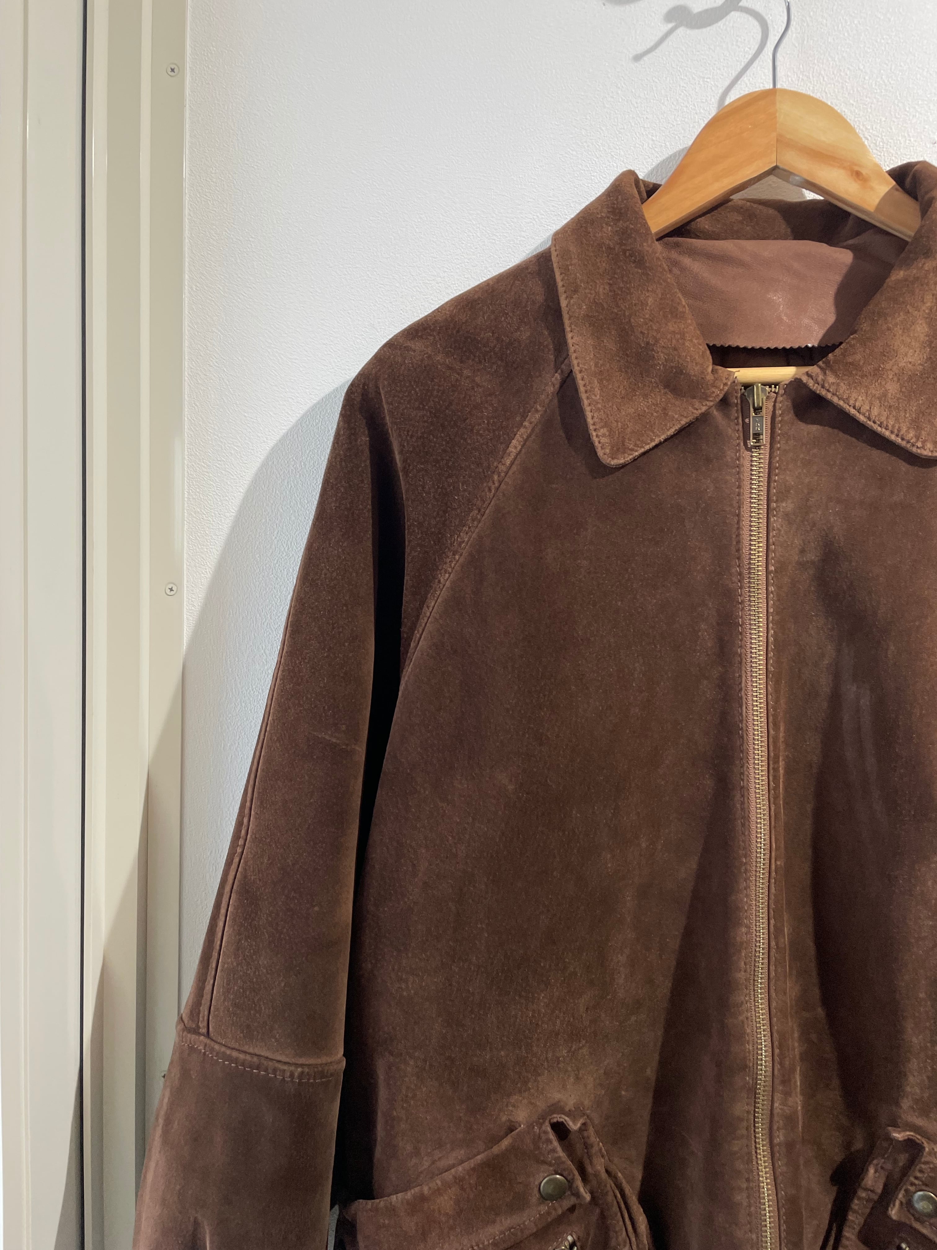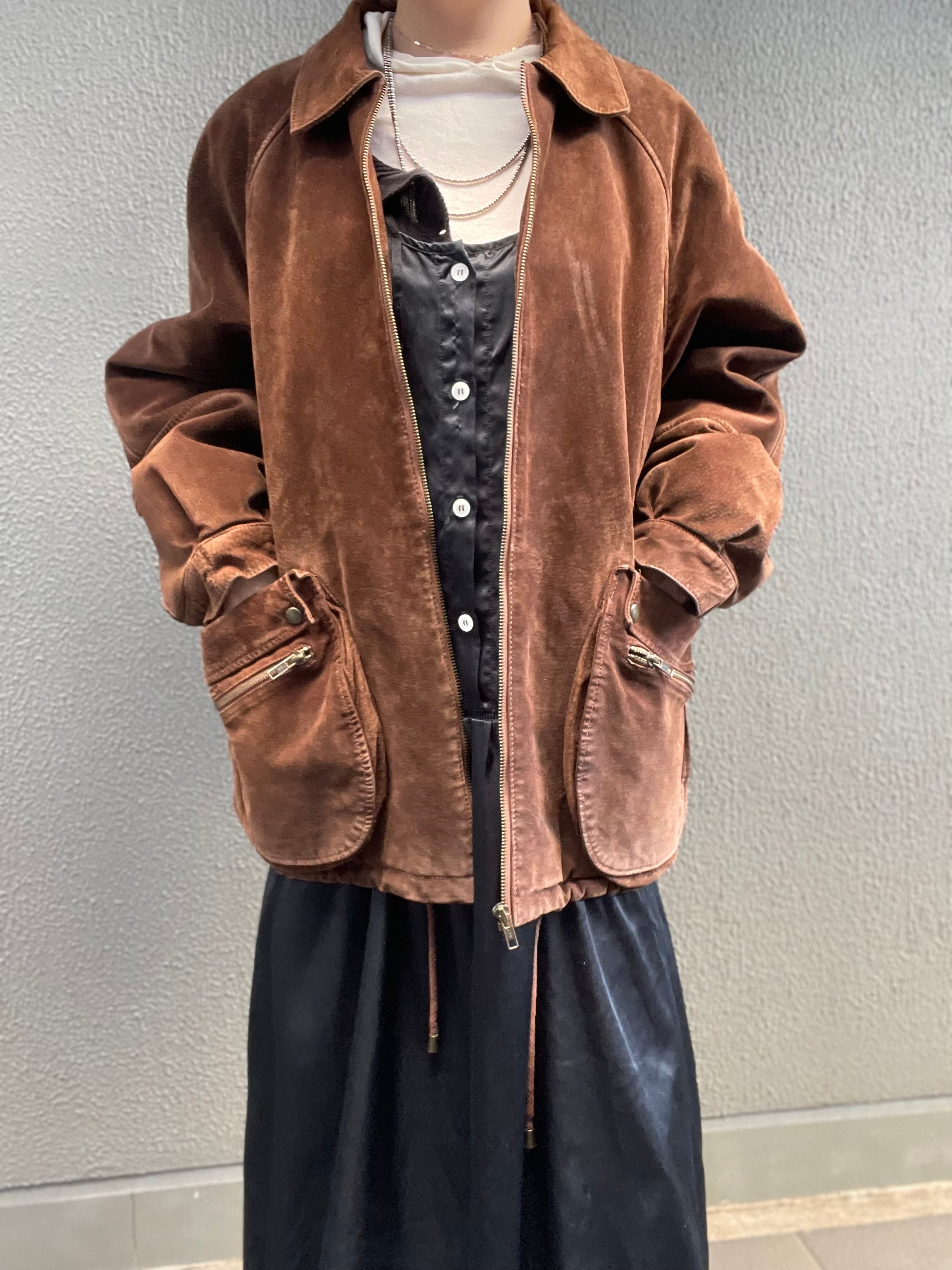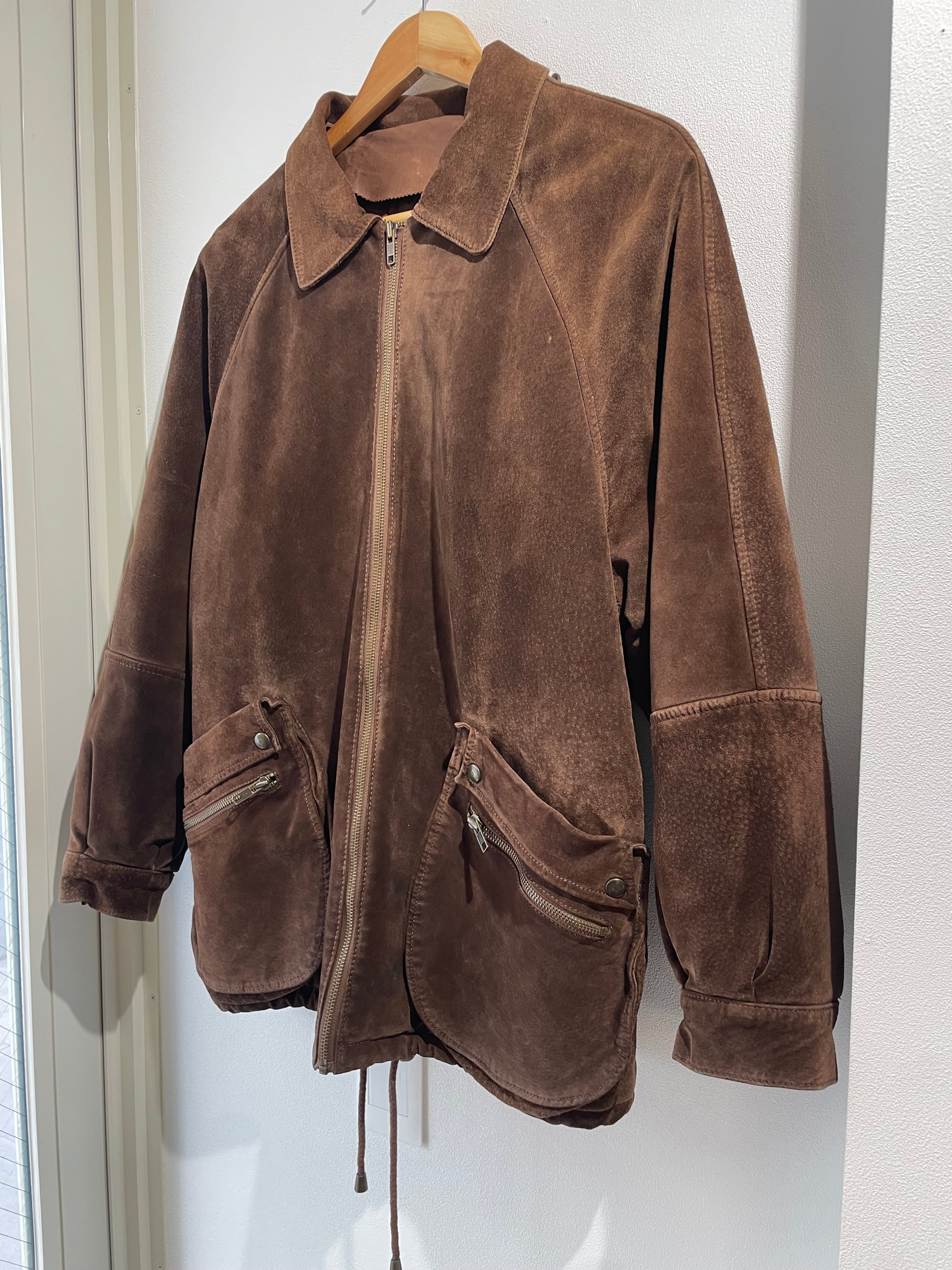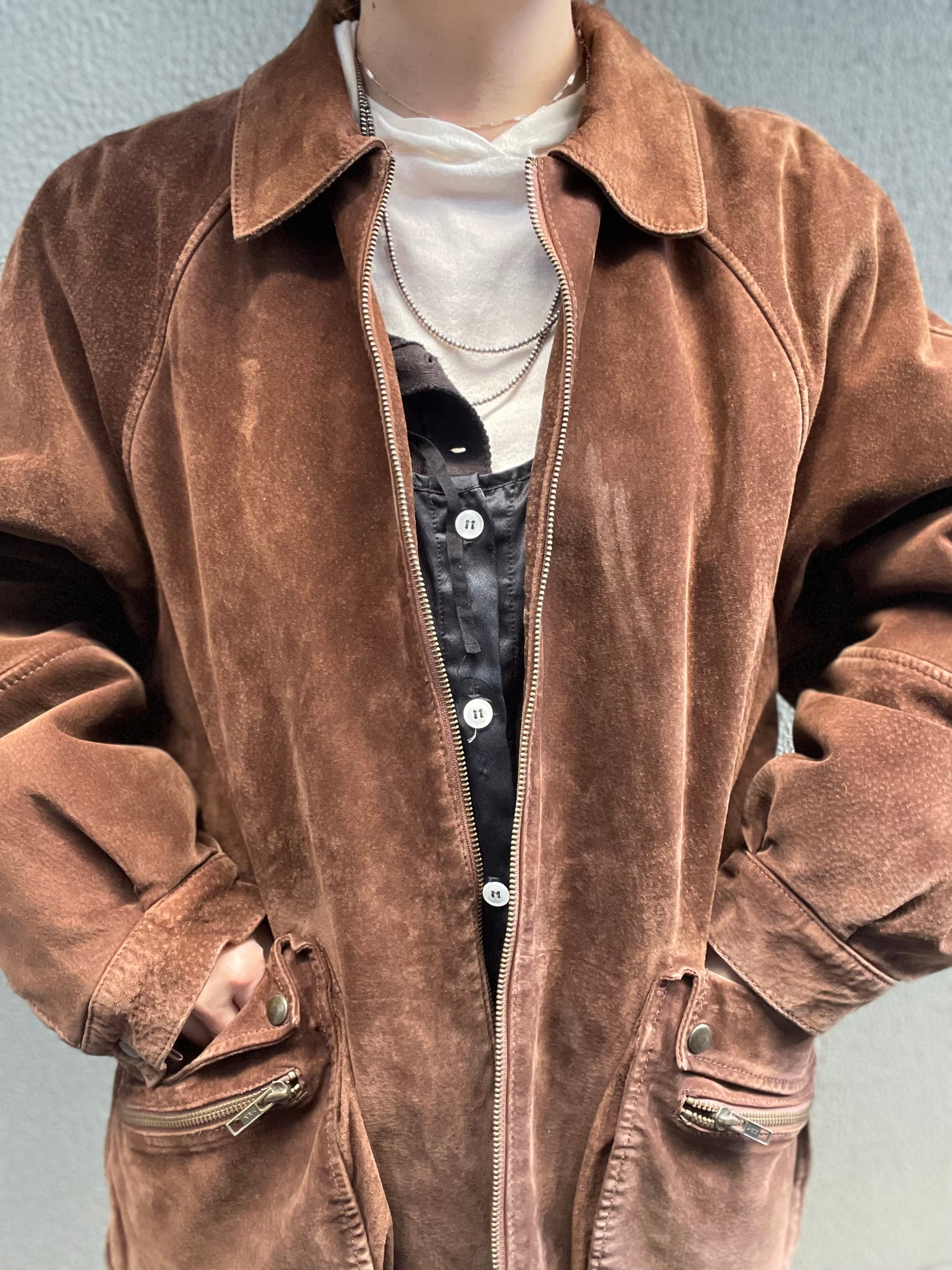 スエードレザーのジャケットは、ビッグサイズで、立体的なポケットがポイントです。