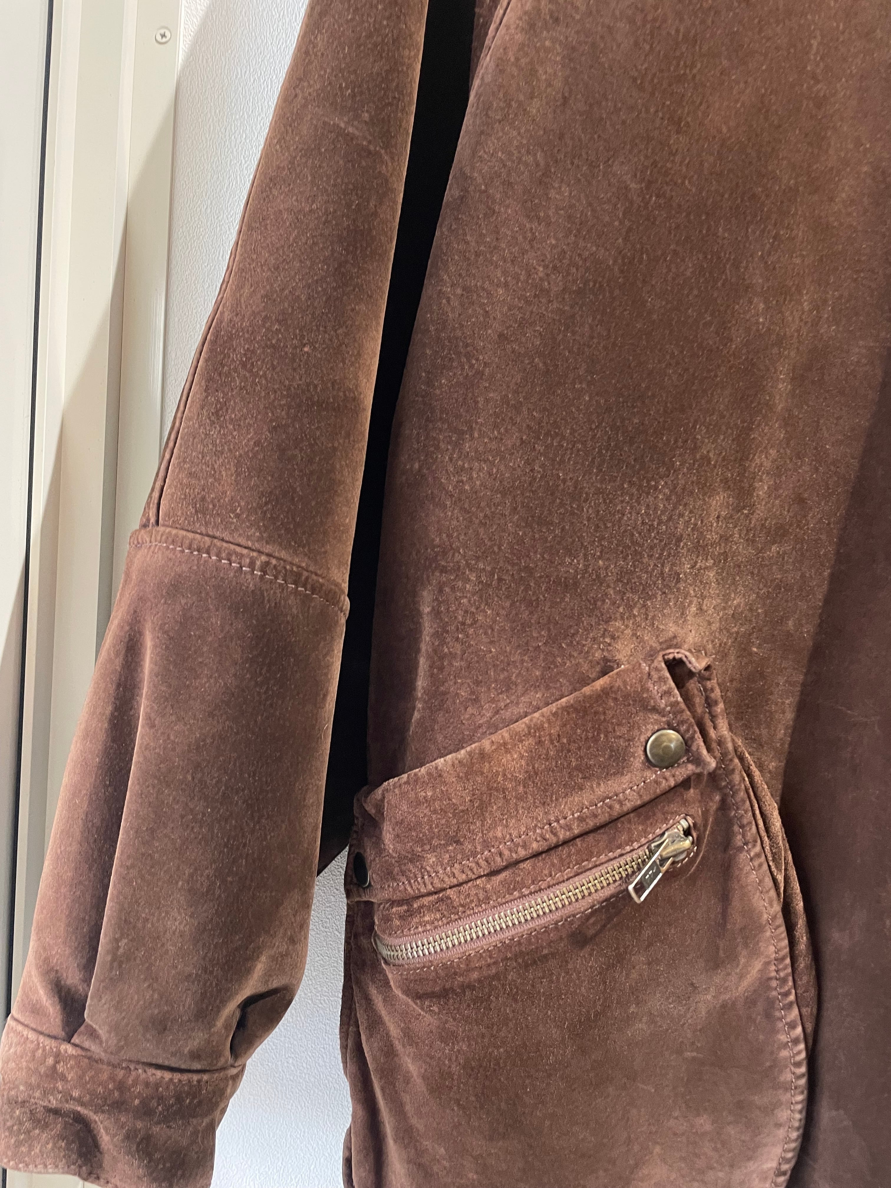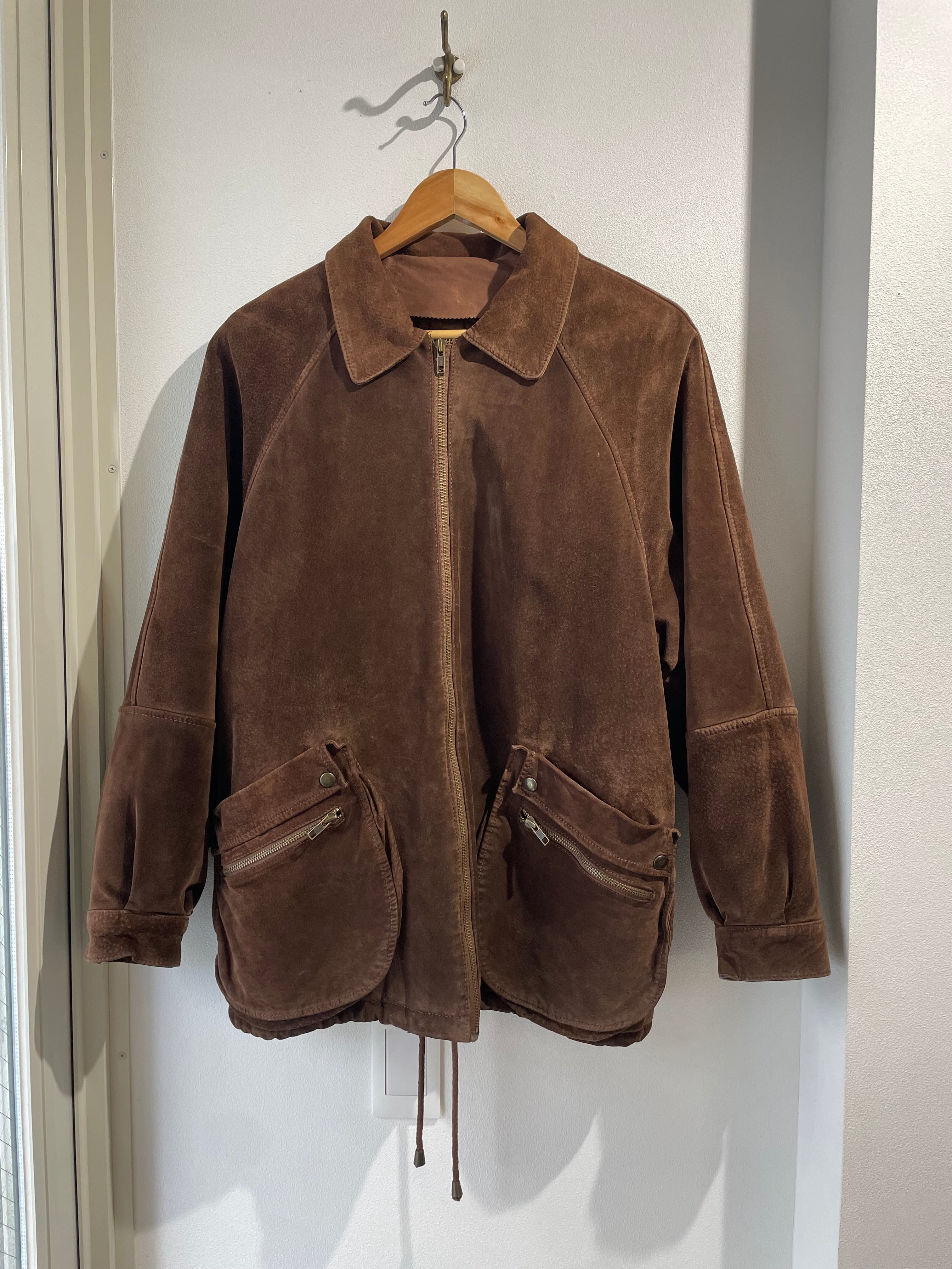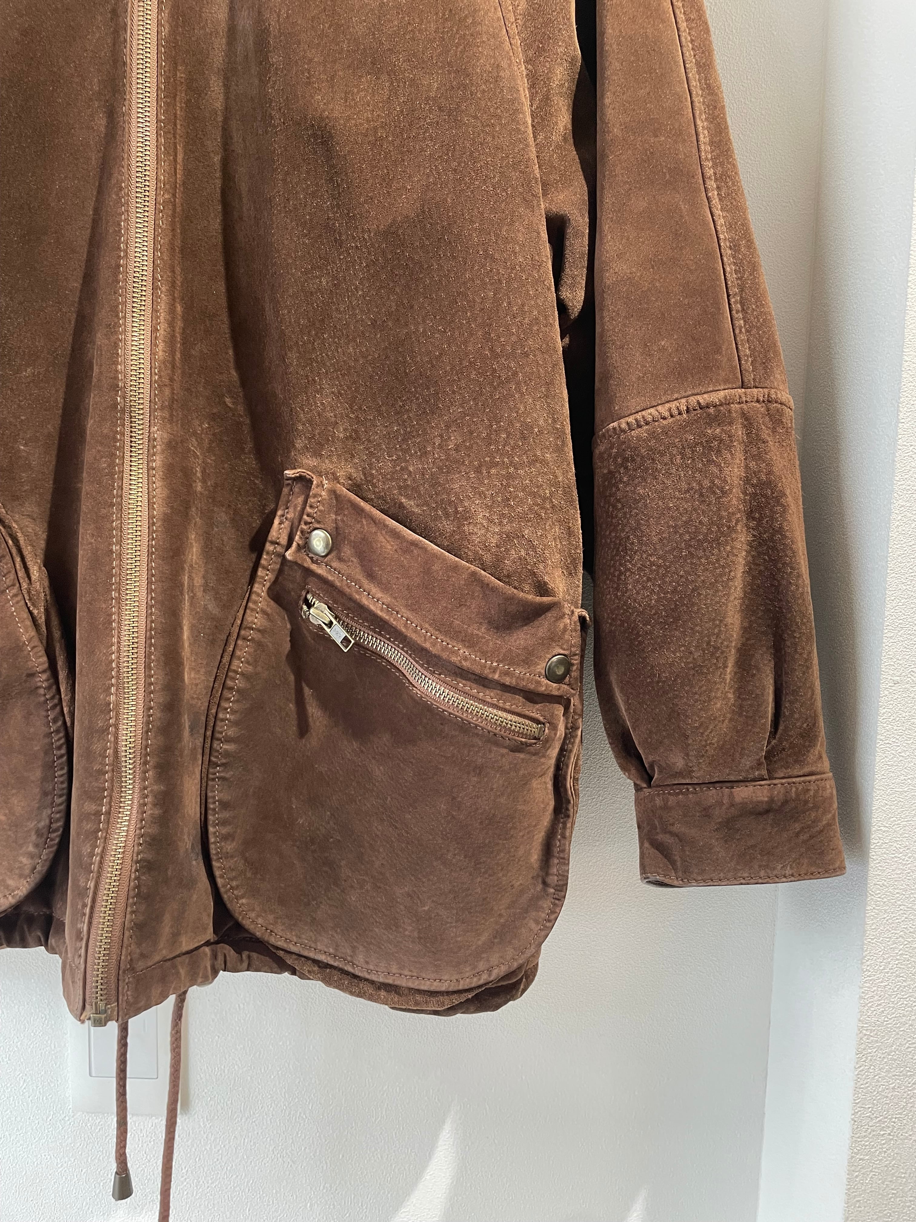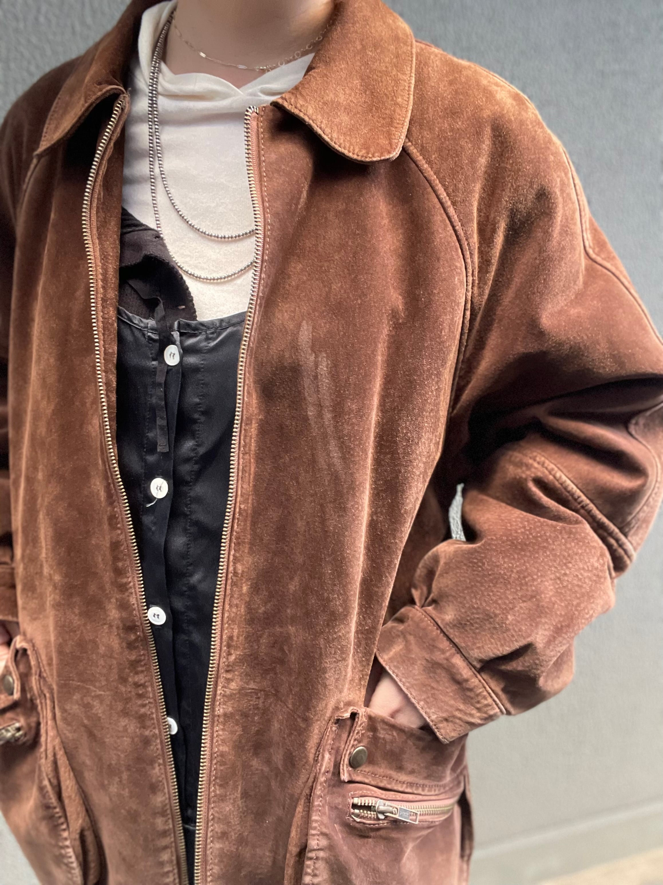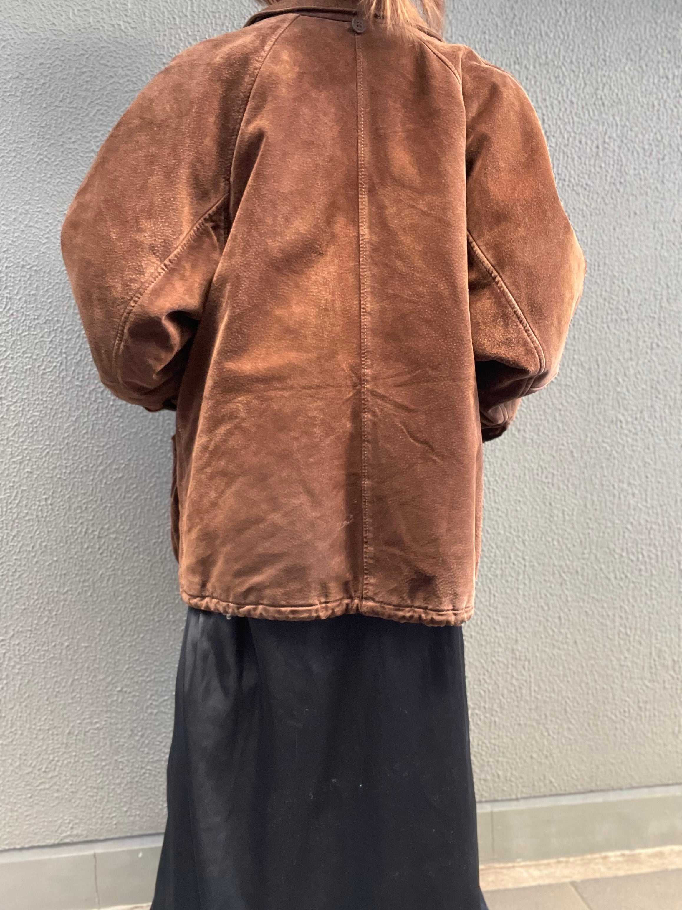 スエードレザーのジャケットは、ビッグサイズで、立体的なポケットがポイントです。